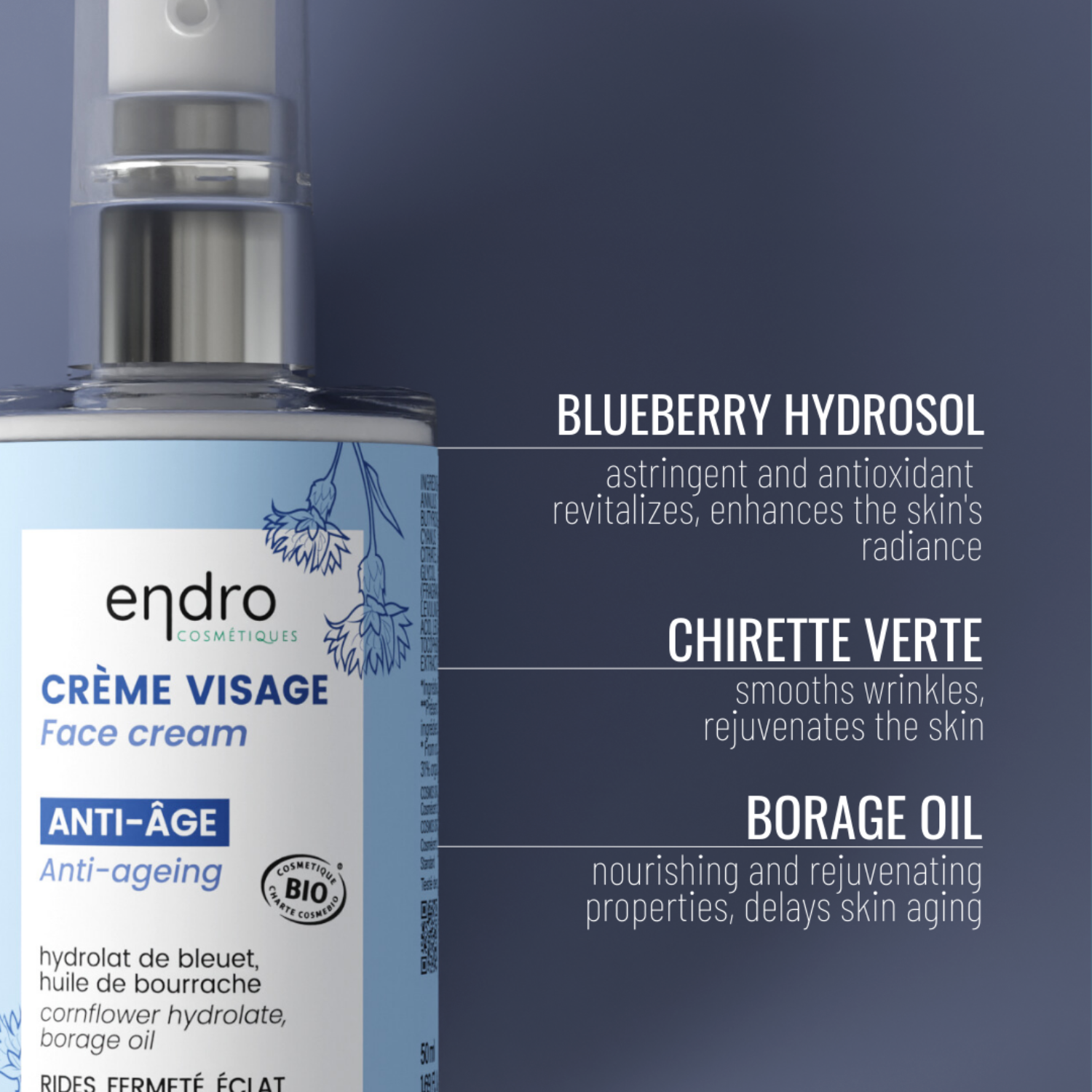 Anti-ageing Day Face Cream : Water, sunflower oil, glycerin, butyrospermum parkii butter, cornflower flower water, glyceryl stearate citrate, borage oil, pentylene glycol, stearyl alcohol, propanediol, acacia gum, fragrance, sodium levulinate, xanthan gum, sodium anisate, lactic acid, radish ferment, tocopherol, green chirette leaf extract, geranol, linalool.
