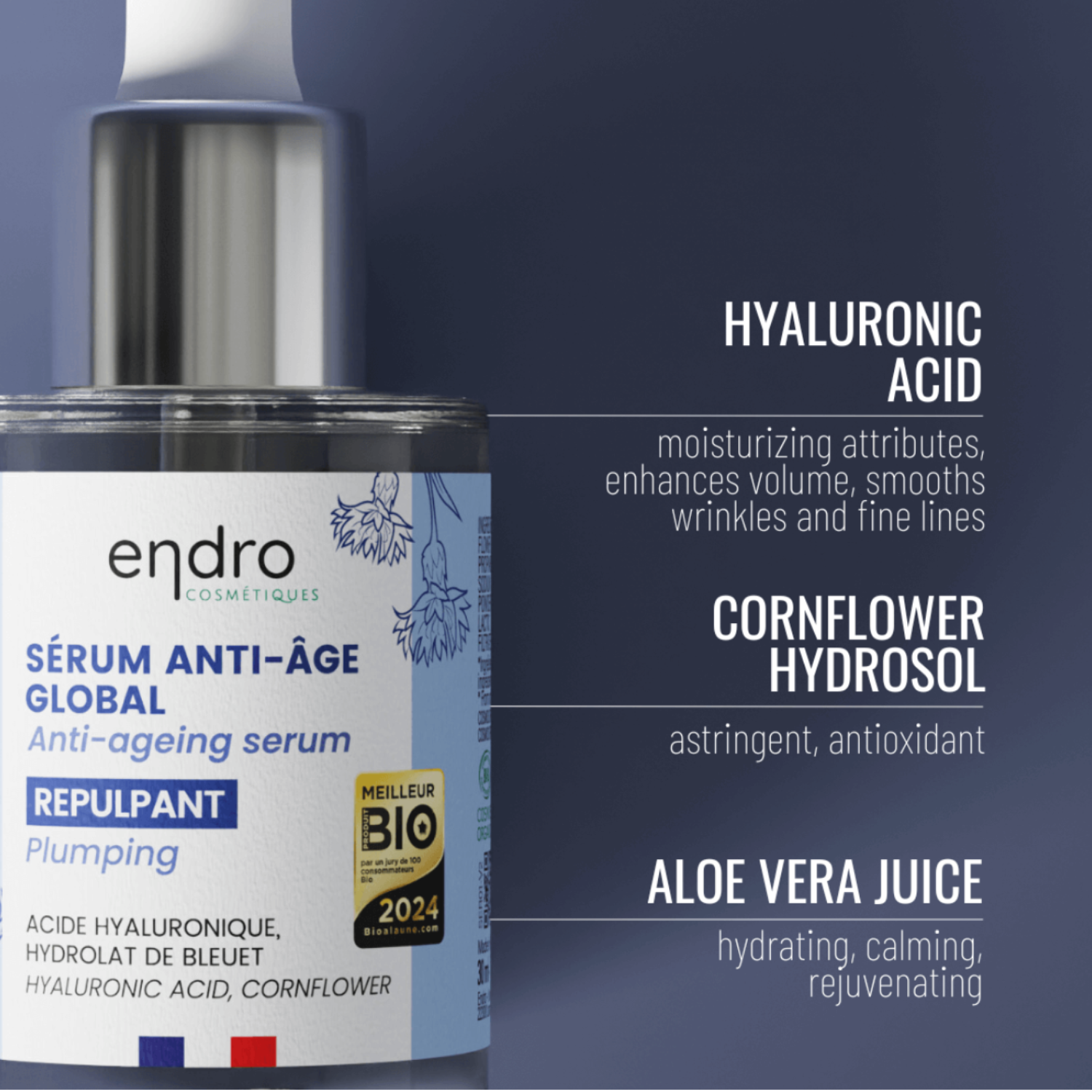 Anti-ageing Plumping Serum : Water, cornflower hydrosol, glycerin, pentylene glycol, propanediol, carrageenan, fragrance, sodium levulinate, aloe vera leaf juice powder, sodium anisate, hyaluronic acid, lactic acid, radish ferment, Sphingomonas hydrophobicum extract.