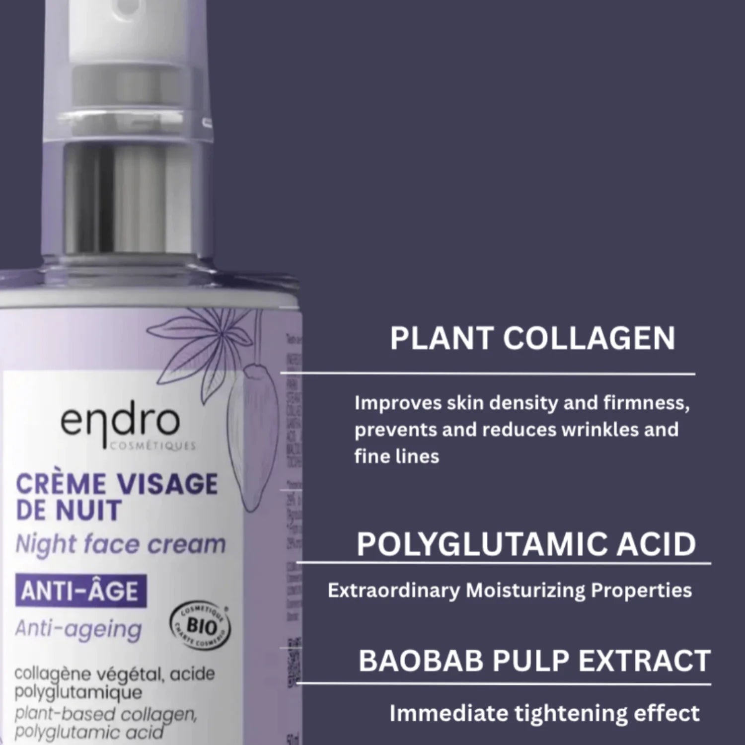 Organic Age Defiance & Moisturizer Night Face Cream with Collagen : 1% collagen, 0.3% polyglutamic acid, baobab pulp extract