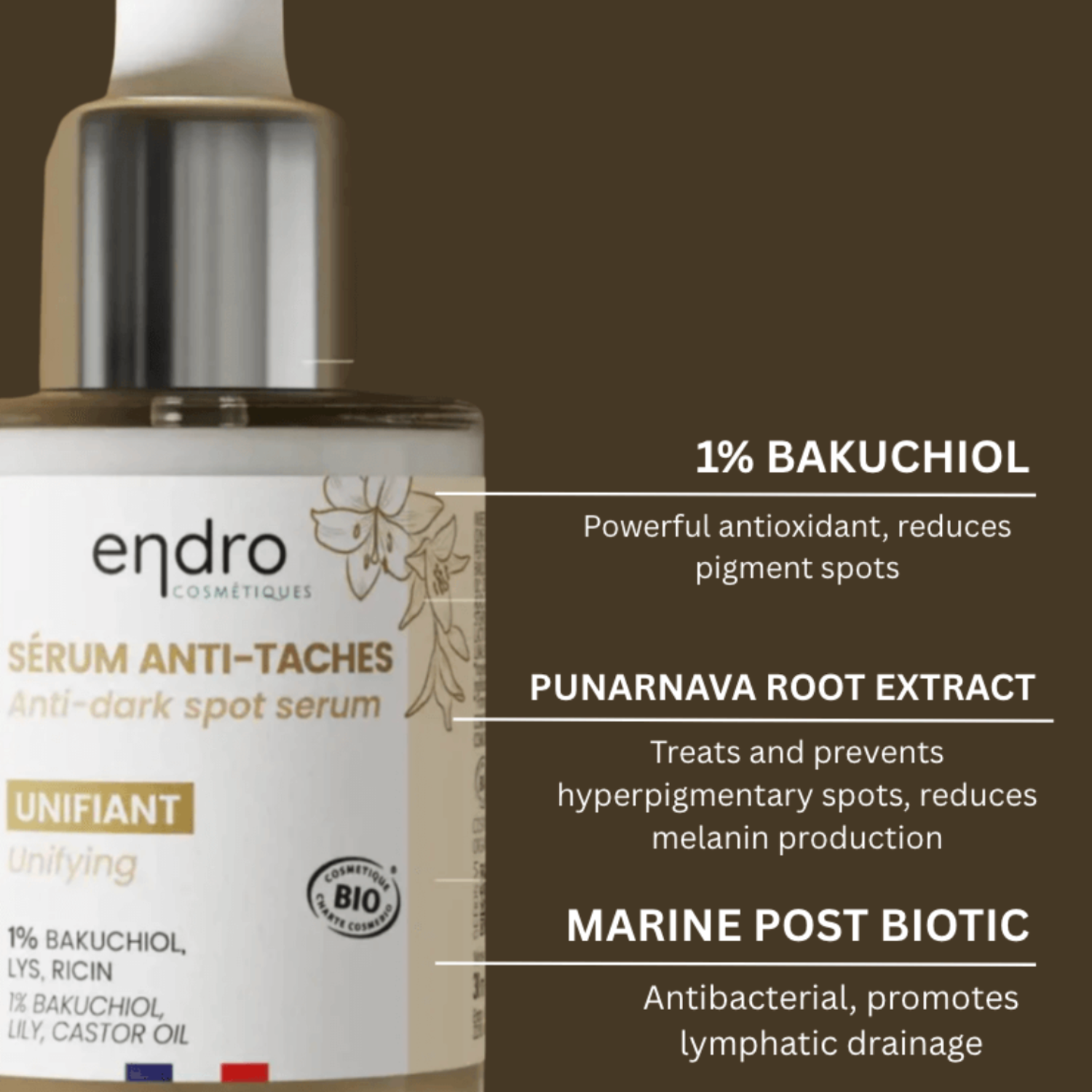 Endro anti-dark spot serum is ideal for removing spots and marks left by acne (scarring and redness). It is applied all over the face. It has a light texture and works to even out skin tone.