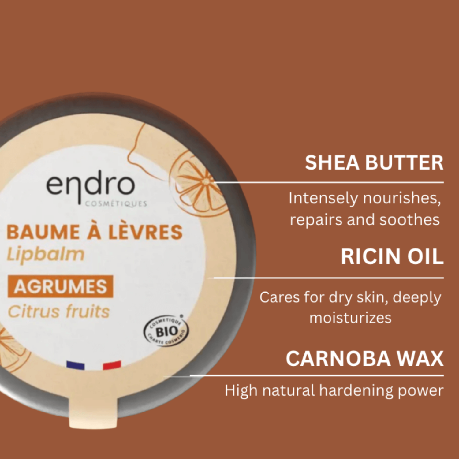 Shea butter*, castor oil*, carnauba wax*, sunflower oil*, natural citrus flavor, tocopherol (vitamin E).