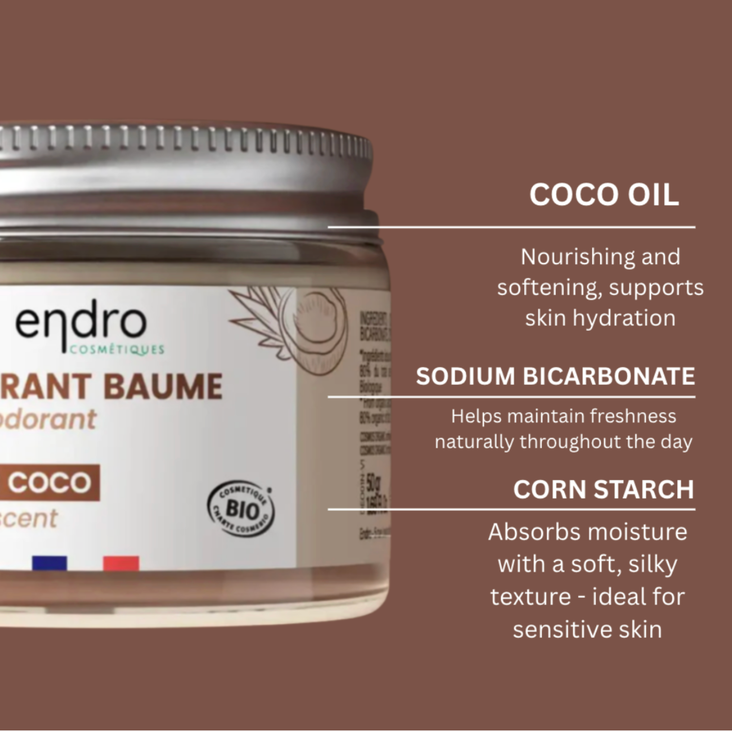 Key ingredients : coconut oil, sodium bicarbonate and corn starch