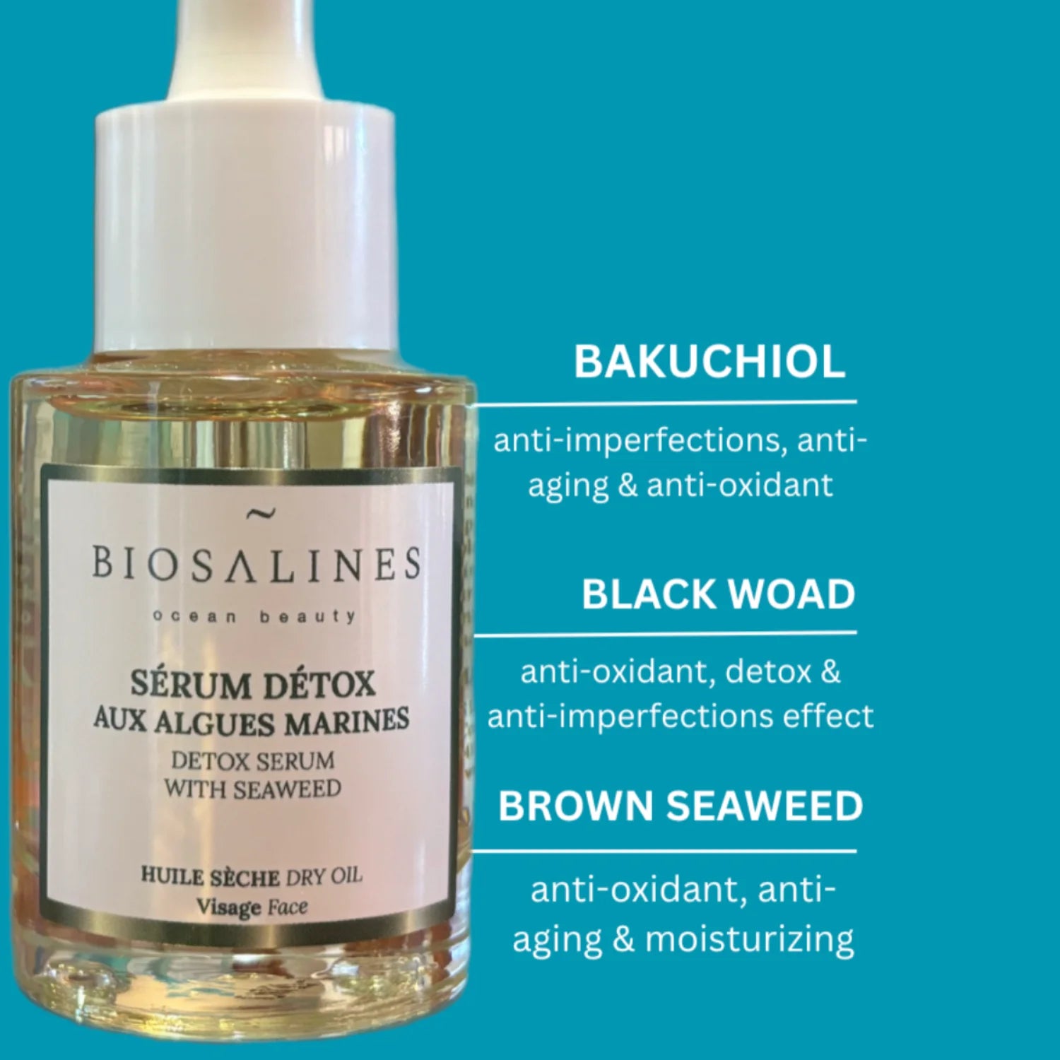 Bakuchiol (anti-imperfections, anti-aging & anti-oxidant), Black Woad (anti-oxidant, detox & anti-imperfections effect) and Brown seaweed (anti-oxidant, anti-aging & moisturizing).