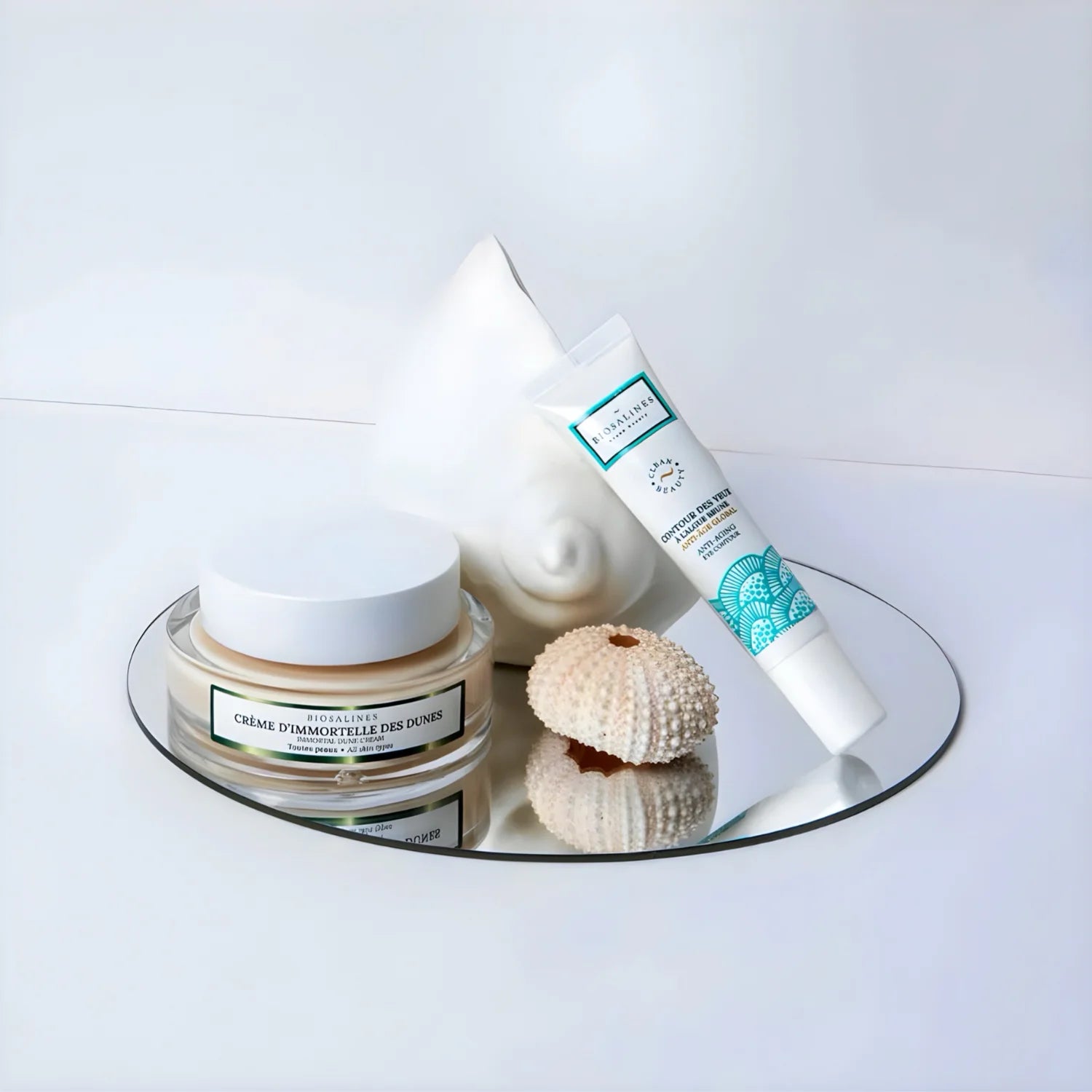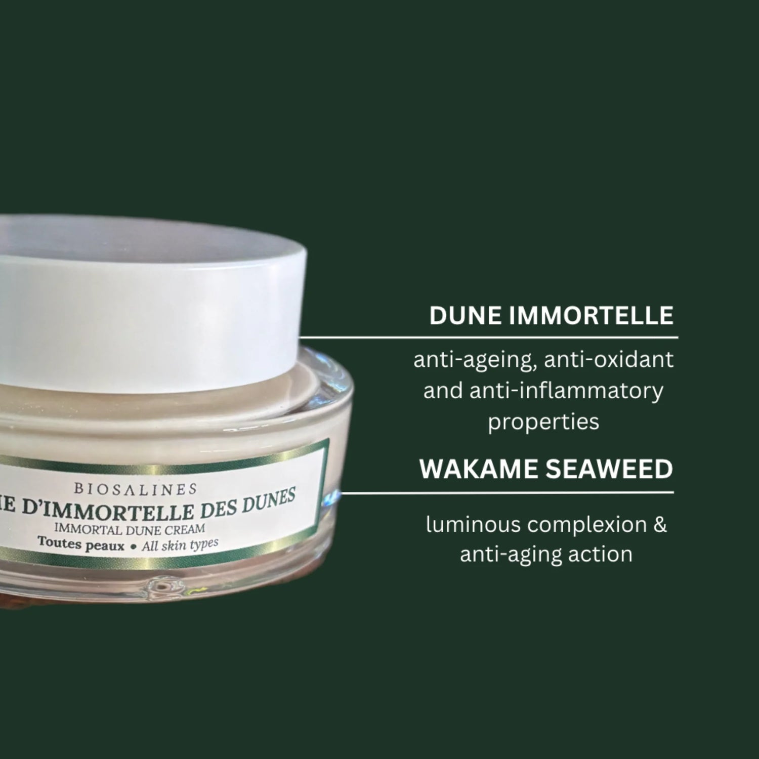 Formulated with dune immortelle, a small plant with golden flowers and eternal youthfulness, this anti-aging cream also contains Wakame seaweed, which has precious anti-aging properties by stimulating collagen and elastin synthesis. Our dune immortelle cream offers the skin a global anti-aging action. It acts on wrinkles and fine lines, firmness, elasticity and radiance.