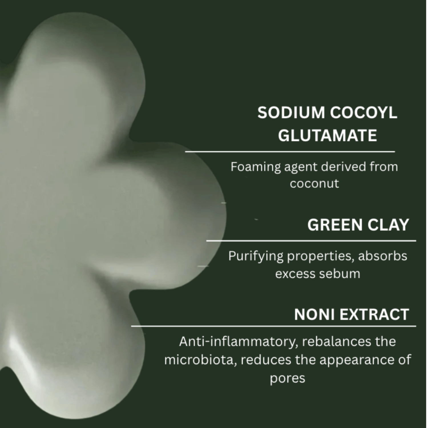 It transforms into a creamy lather to cleanse and purify your skin without drying it out. It cleanses and purifies your skin with green clay and noni extracts without stripping it, maintaining its balance.