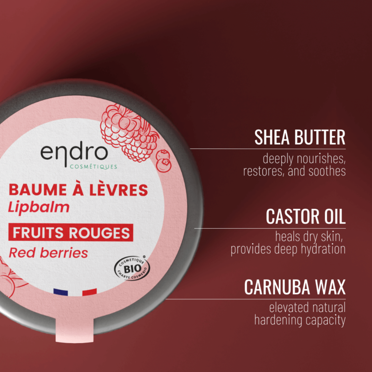Shea butter*, castor oil*, carnauba wax*, sunflower oil*, natural red berry flavor, tocopherol (vitamin E).