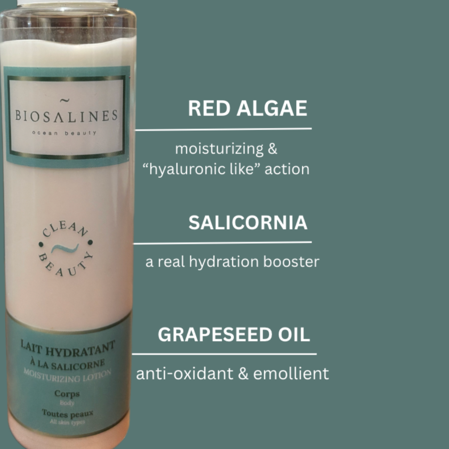 Red algae (moisturizing & “hyaluronic like” action), Salicornia (a real hydration booster) and Grapeseed oil (anti-oxidant & emollient).