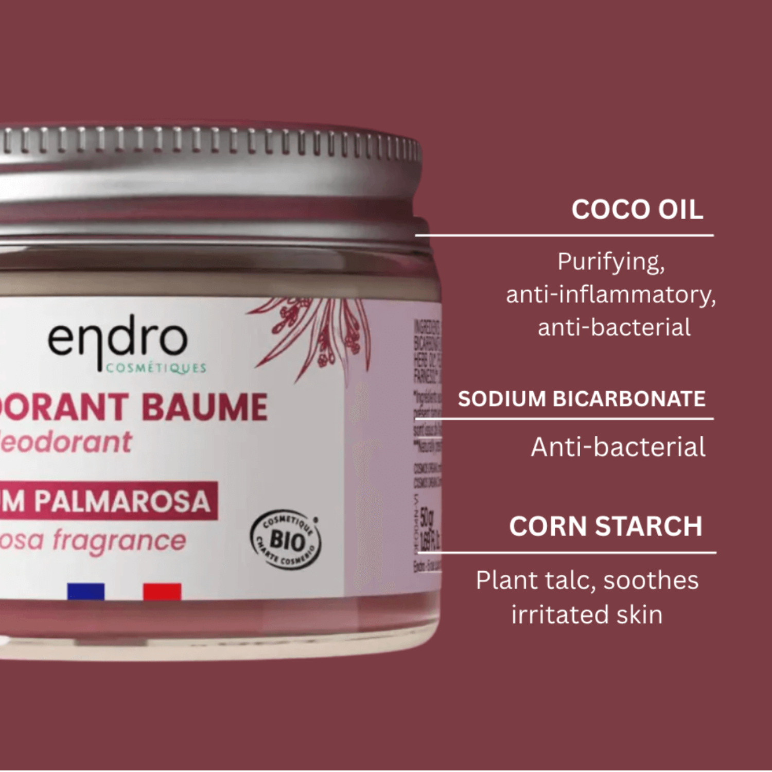 Contrary to popular belief, sweat is virtually odorless. It's bacteria that are responsible for unpleasant body odors. Our natural deodorant contains organic coconut oil and sodium bicarbonate, which have purifying and antibacterial properties. Added to this are essential oils of palmarosa and geranium, which are broad-spectrum antibacterial and antifungal agents. The little extra is corn starch, a natural moisture absorber for dry underarms !